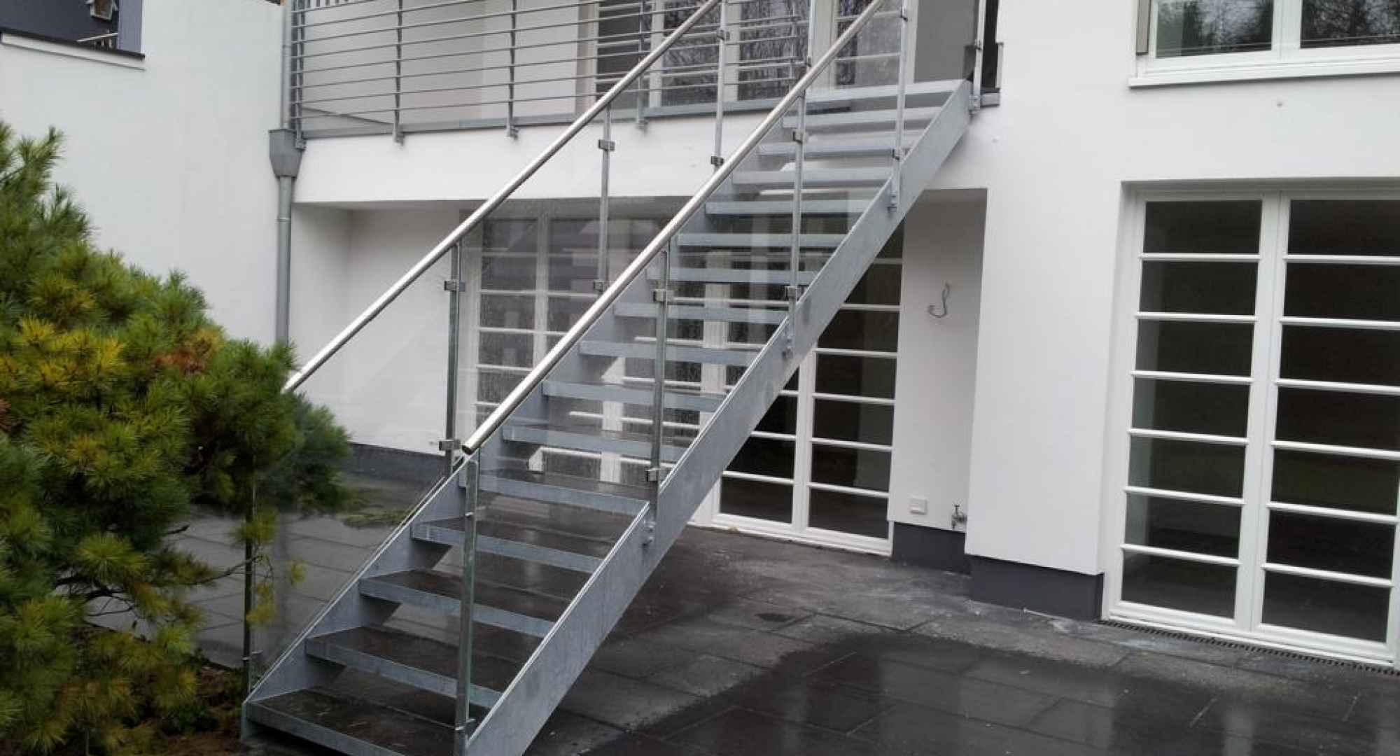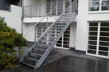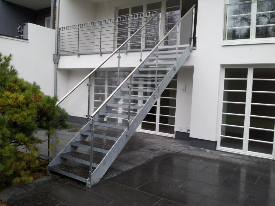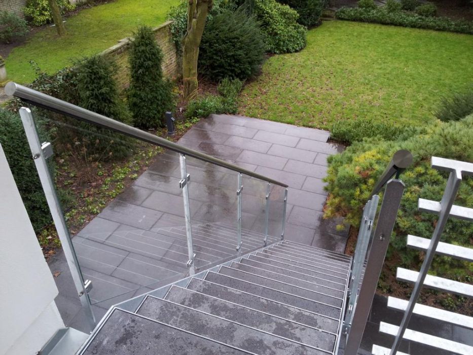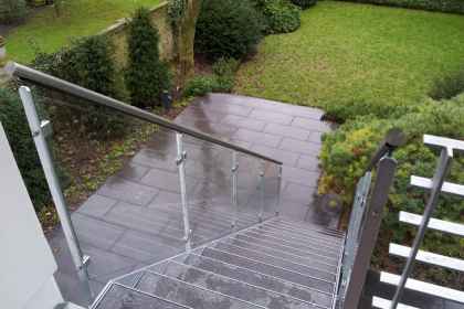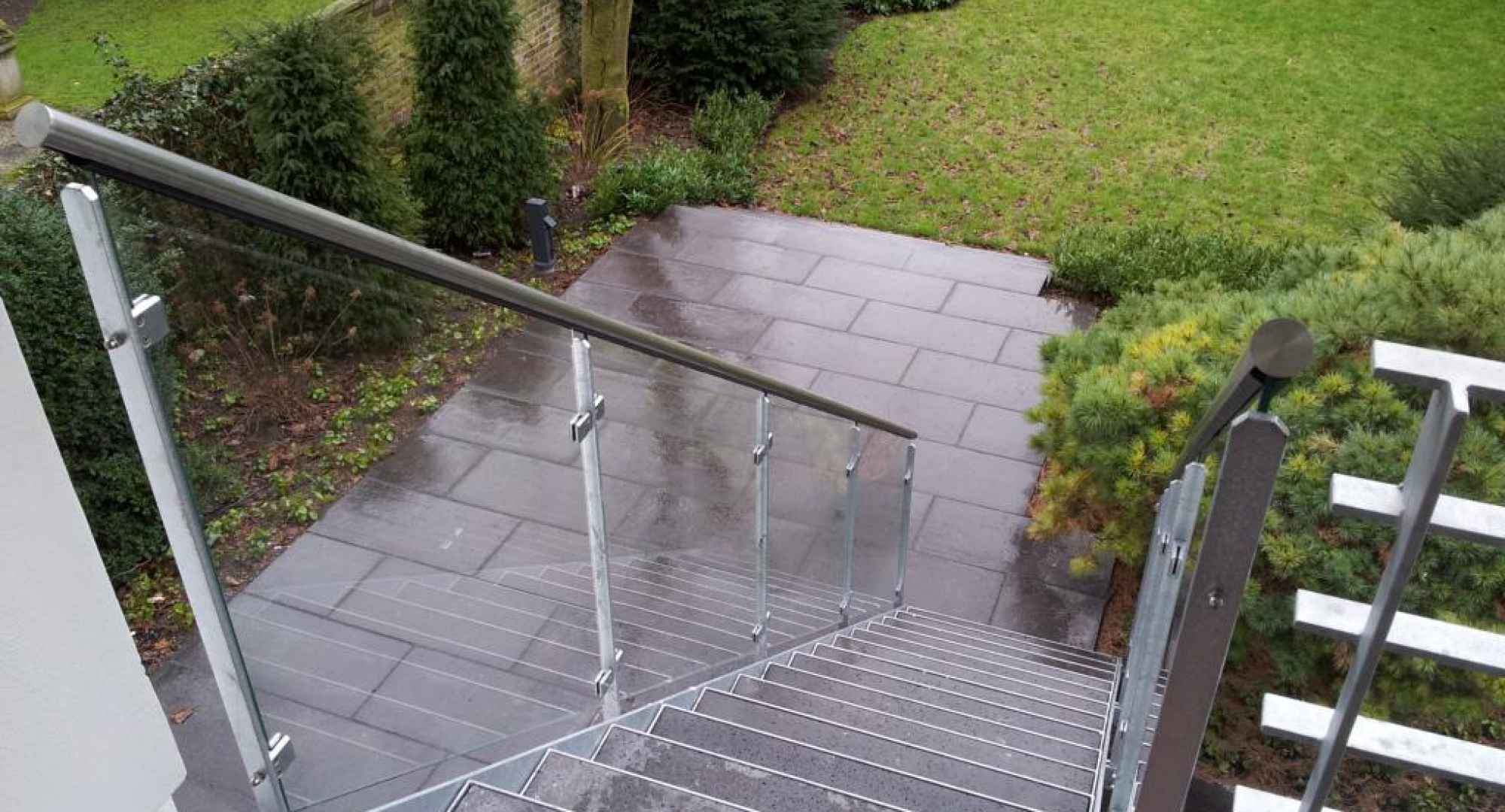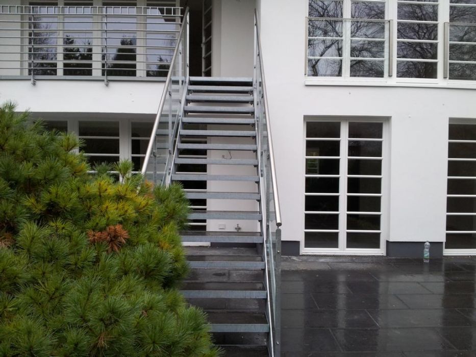 Wangentreppe in feuerverzinkter Ausführung mit Kastenstufen und eingelegten Natursteinen in Düsseldorf. Geländerausführung mit Flachstahlpfosten und Glasfüllung sowie einem aufgesetzten Edelstahlnuthandlauf.