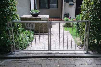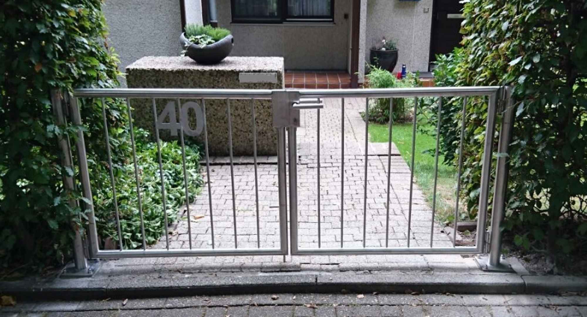 Neuanfertigung eines 2-flügeligen Edelstahltores mit integrierter Hausnummer in Erkrath.