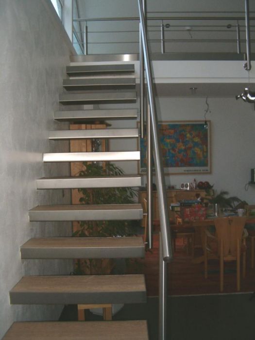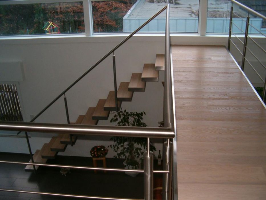 Treppenkonstruktion in Haan mit Stufen aus Edelstahlblech gekantet und eingelegtem Holzparkett. Die Wange wurde unsichtbar in der Wand verankert.