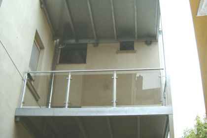 2-geschossige Balkonanlage in einem Hinterhof in Hilden. Balkon auf 1-er Stütze und Wandauflager. Bodenbelag best. aus Bankirai und das Geländer wurde ausgeführt mit einer Glasfüllung - Farbfolie Evening Shadow.