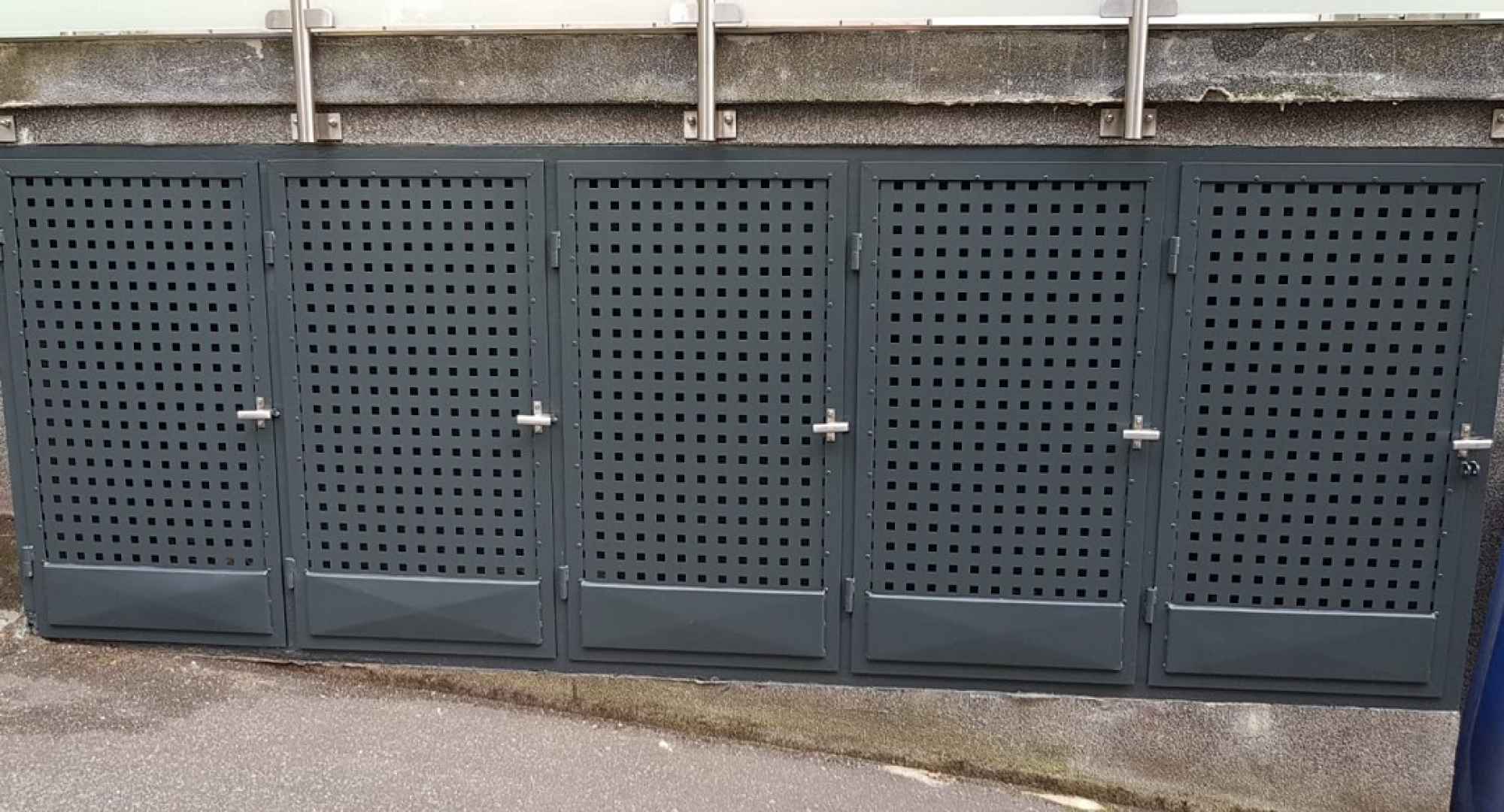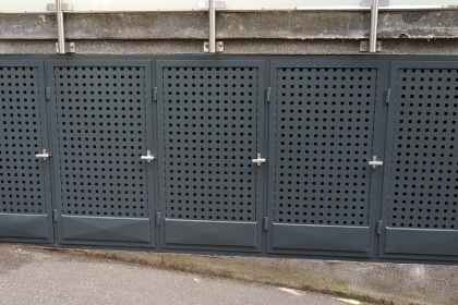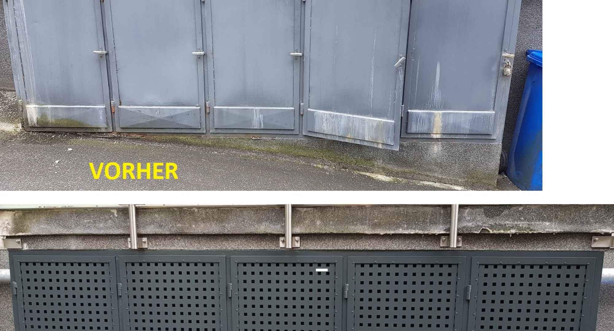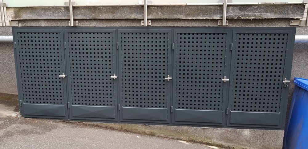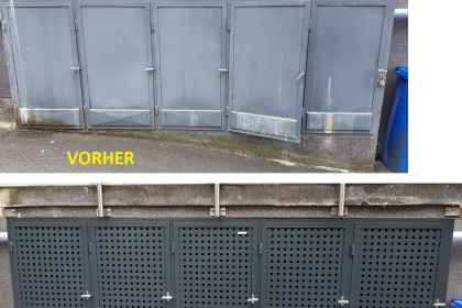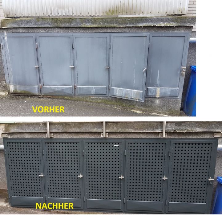 Hier sehen Sie eine Aufarbeitung von Stahltüren einer Mülltonnenbox in Hilden. Die Türen wurden ausgebaut, gerichtet, sandgestrahlt und mit neuen Lochblechen versehen. Die Stahltüren wurden komplett feuerverzinkt nach DIN EN 1461 und pulverbeschichtet in RAL Farbe 7016.