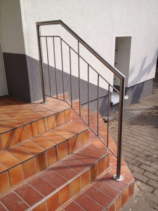 Beidseitiger Geländerbügel als Aufstiegshilfe an einer Aussentreppe in Hilden aus Edelstahl 1.4301, Korn 240, matt gebürstet und Füllung mit senkrechten Stäben aus Rundstahl ø 12.
