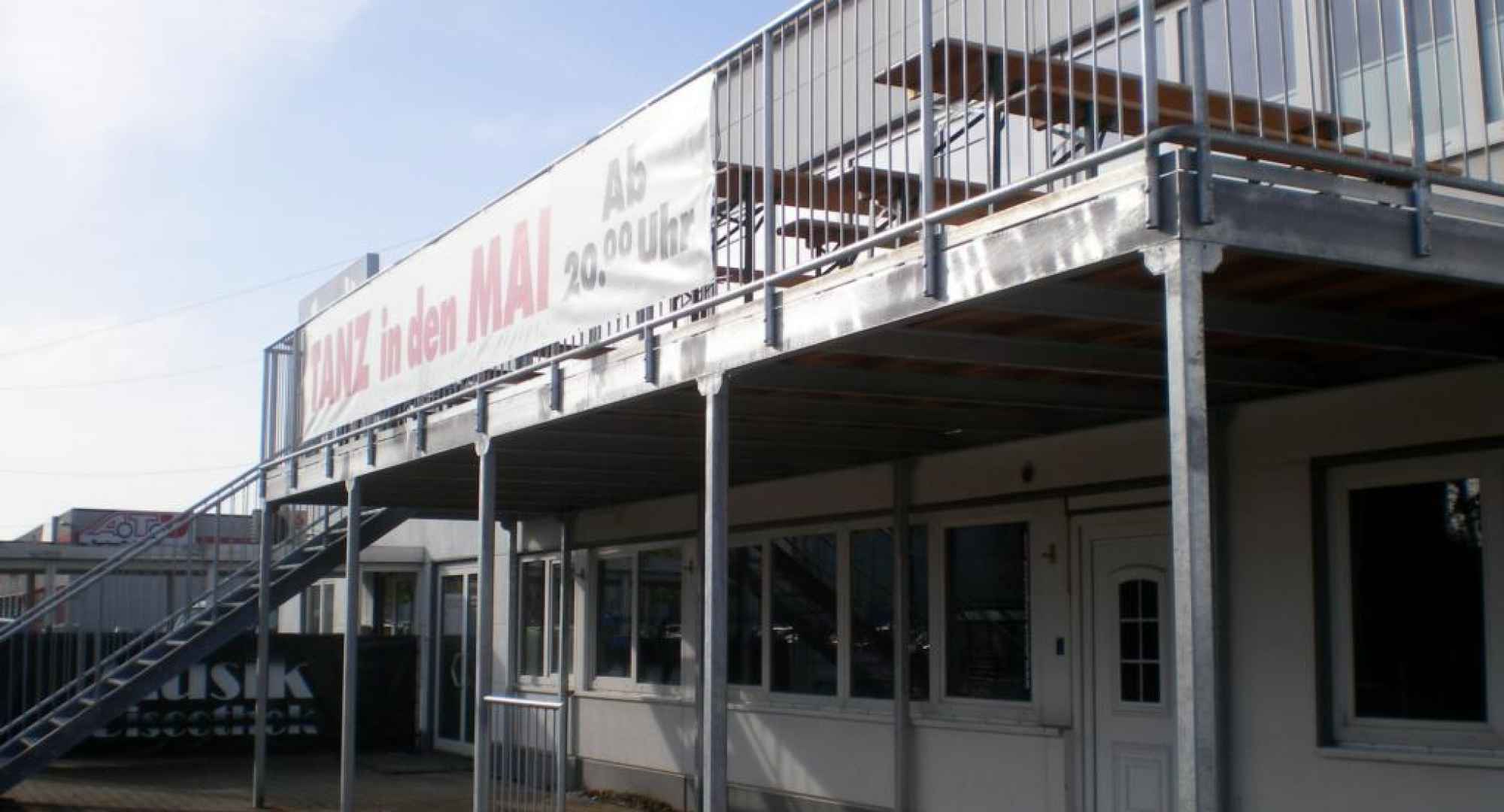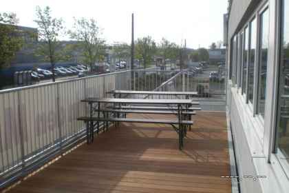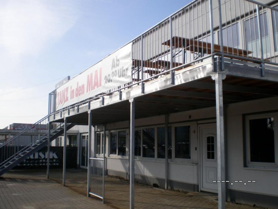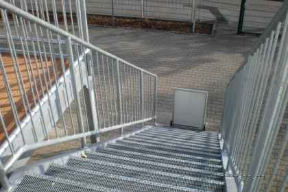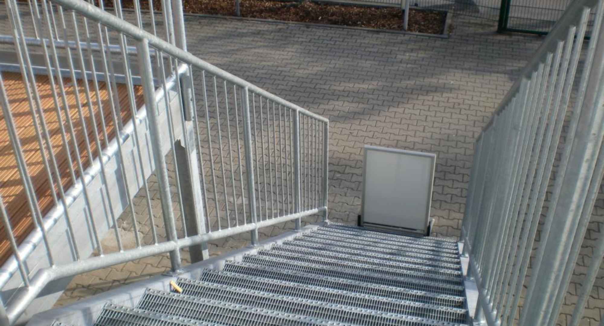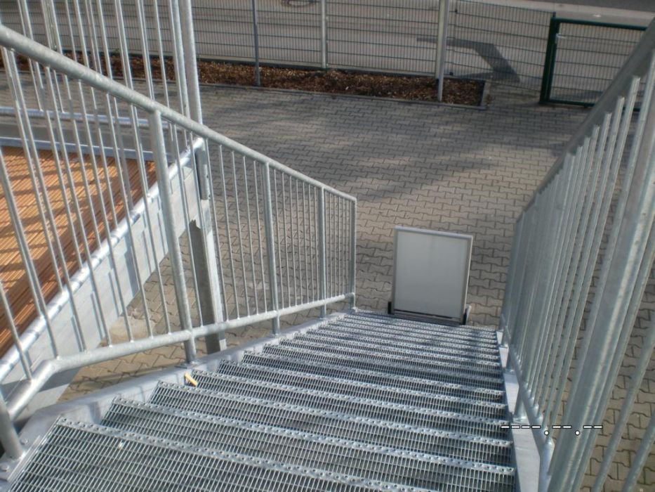 Balkon- bzw. Terrassenanlage mit geradläufiger Wangentreppe in feuerverzinkter Ausführung in Langenfeld.