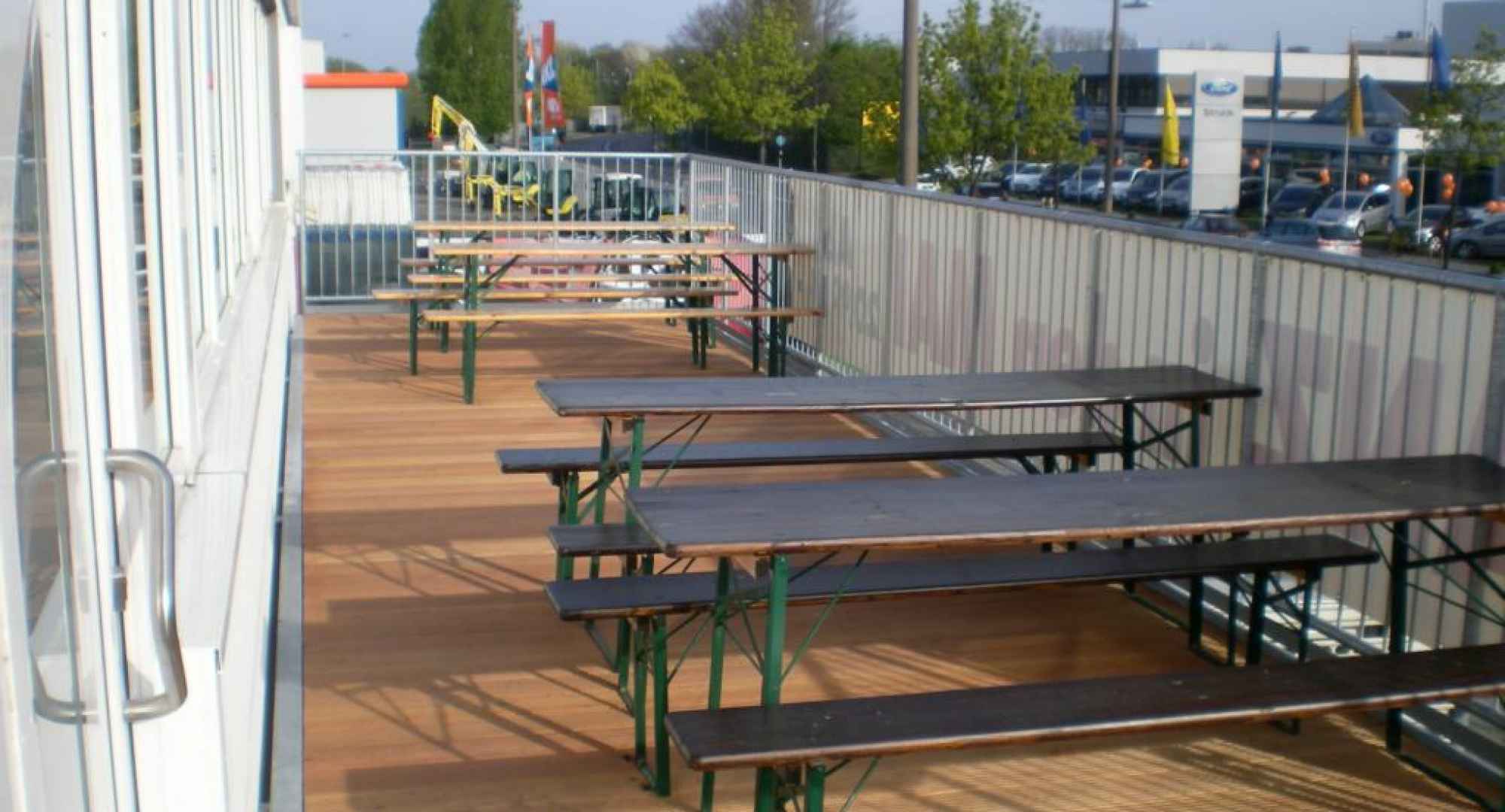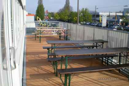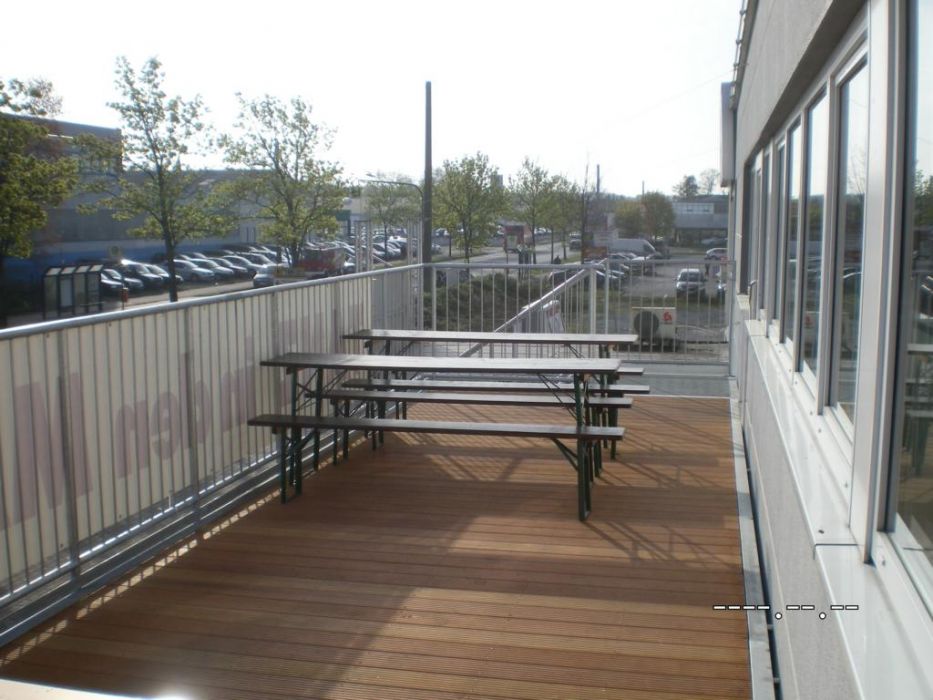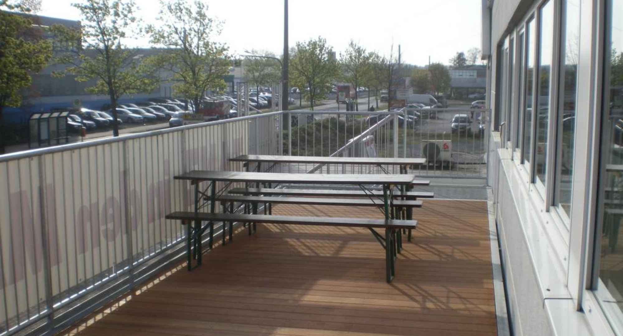 Balkon- bzw. Terrassenanlage mit geradläufiger Wangentreppe in feuerverzinkter Ausführung in Langenfeld.