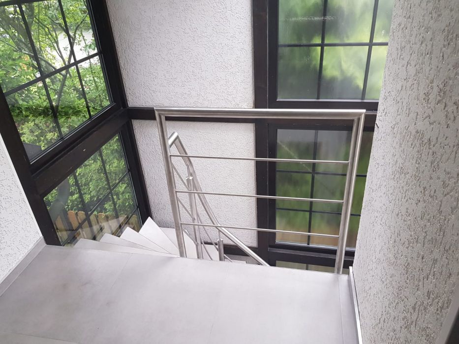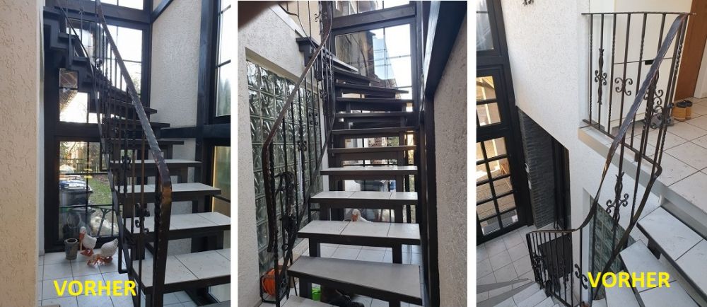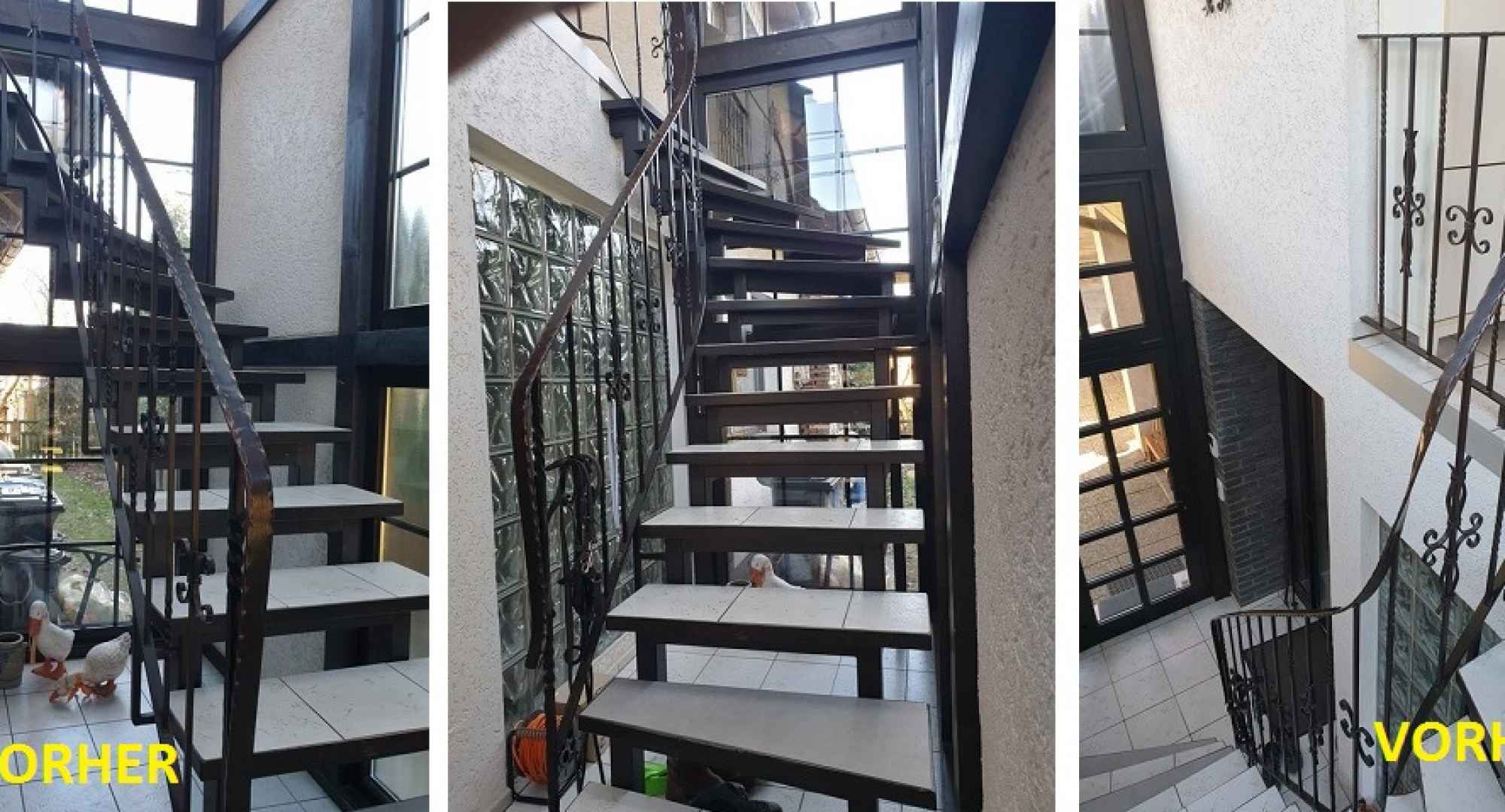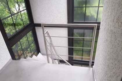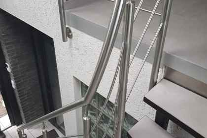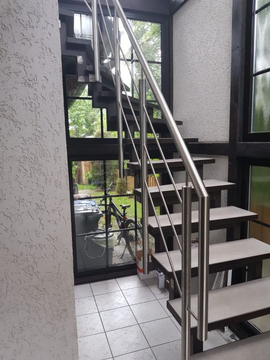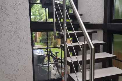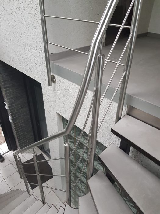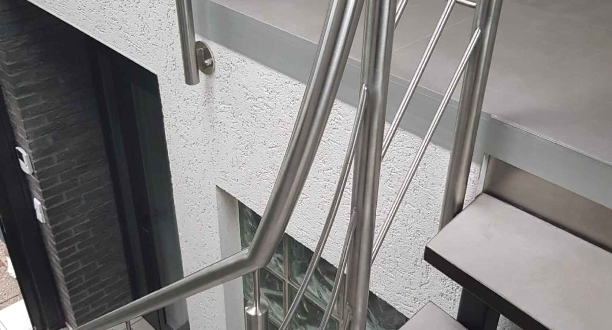 Hier sehen Sie die Sanierung einer Bestandsholmtreppe in einem Einfamilienhaus in Leichlingen. Bestandsgeländer demontiert - neues Edelstahlgeländer besteht aus senkrechten Pfosten und Handlauf aus Rundrohr ø 42,4mm. 3 Stück Kniegurte aus Rundstahl ø 12mm der Neigung des Handlaufs folgend. Komplett Edelstahl (1.4301), Korn 240, matt gebürstet