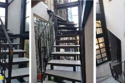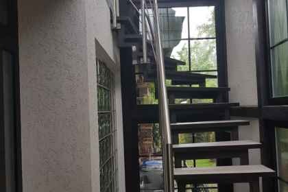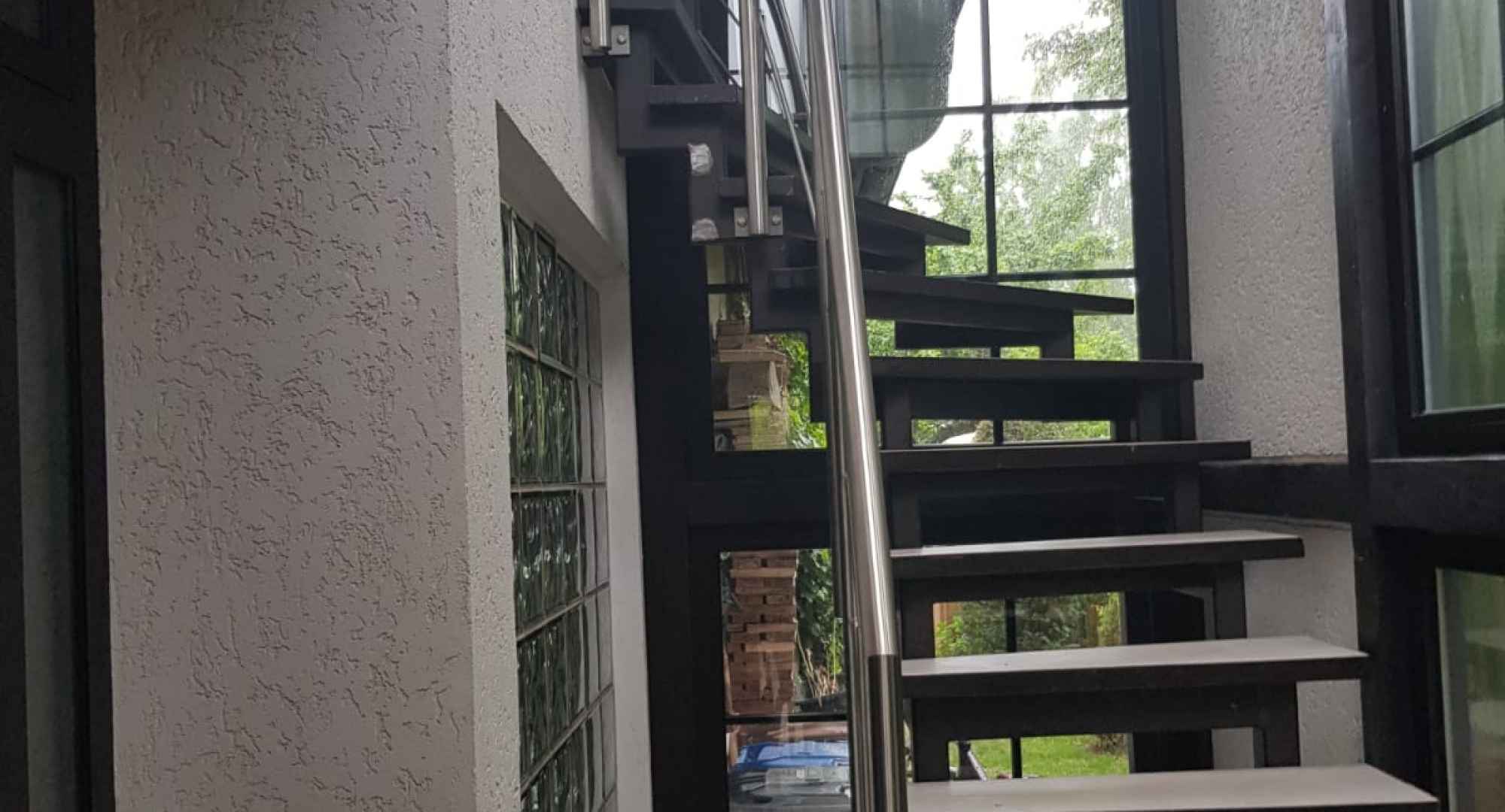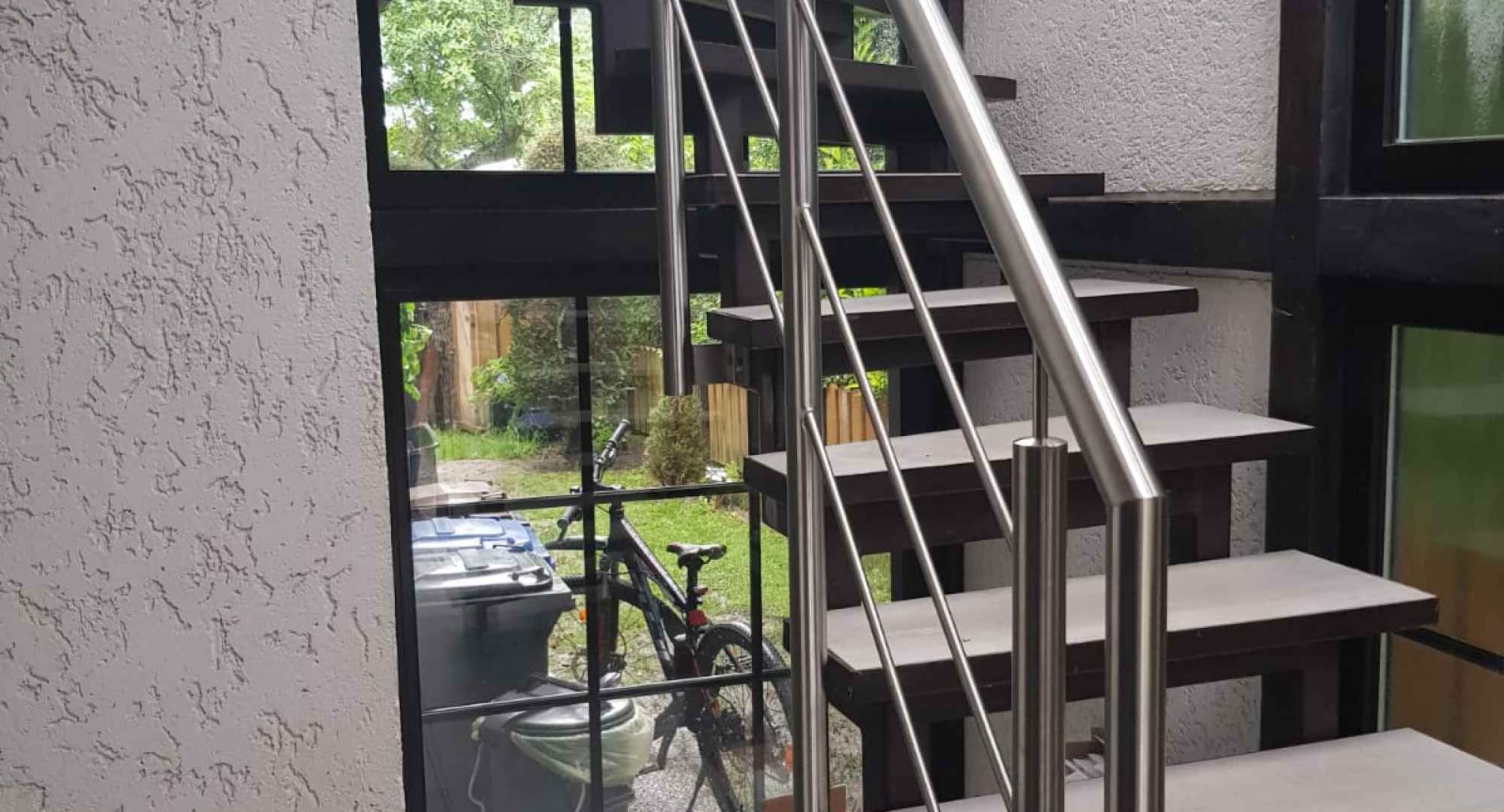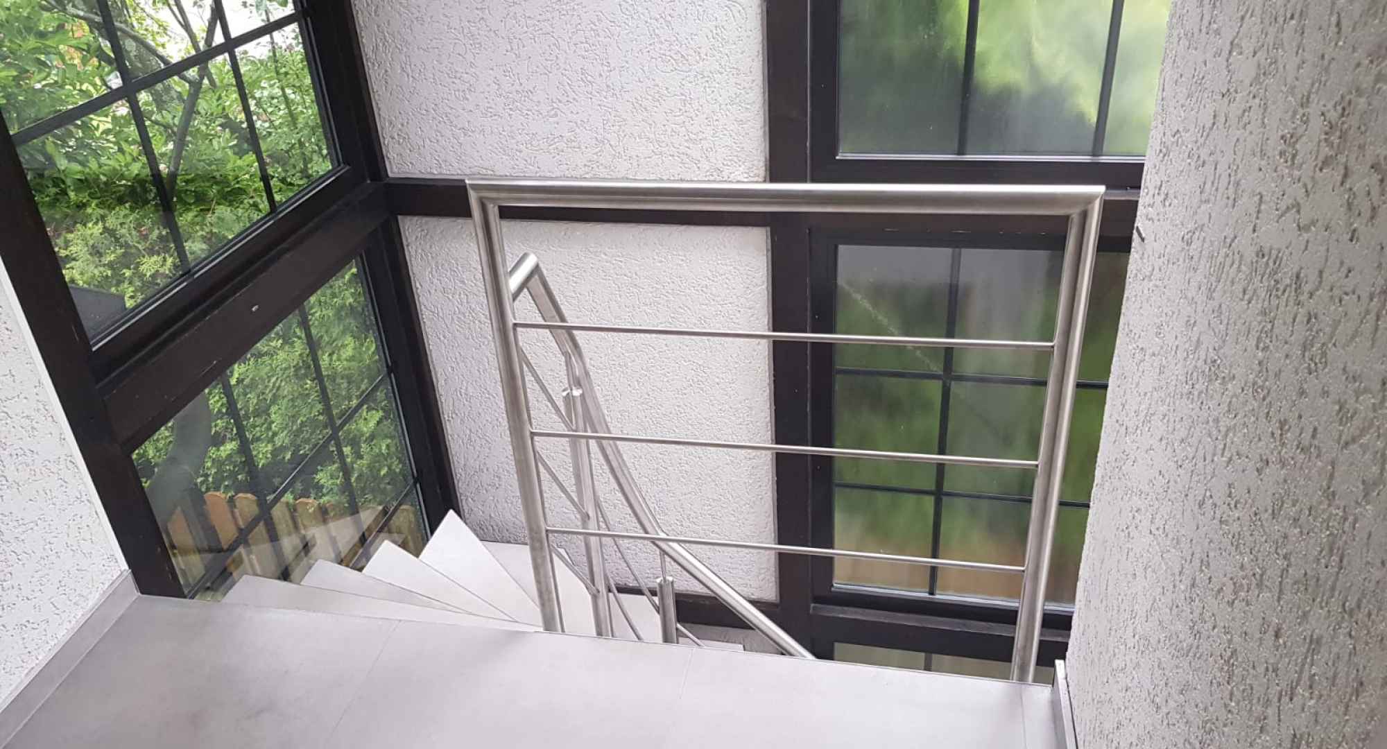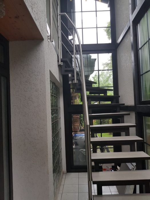 Hier sehen Sie die Sanierung einer Bestandsholmtreppe in einem Einfamilienhaus in Leichlingen. Bestandsgeländer demontiert - neues Edelstahlgeländer besteht aus senkrechten Pfosten und Handlauf aus Rundrohr ø 42,4mm. 3 Stück Kniegurte aus Rundstahl ø 12mm der Neigung des Handlaufs folgend. Komplett Edelstahl (1.4301), Korn 240, matt gebürstet