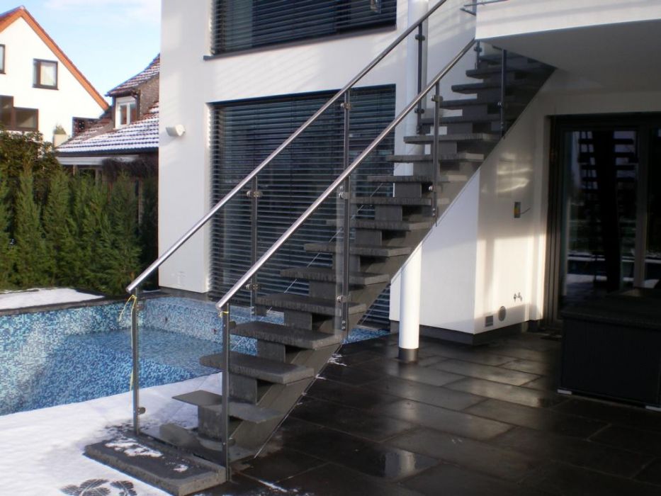 Hier sehen Sie eine Mittelholmtreppe mit Natursteinbelag. Die Treppengeländer haben eine Glasfüllung mit Klarglas und die Balkongeländer sind ausgeführt mit waagerechten Stäben. Alle Materialien Edelstahl, 1.4301, Korn 240, matt geschliffen.