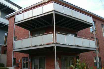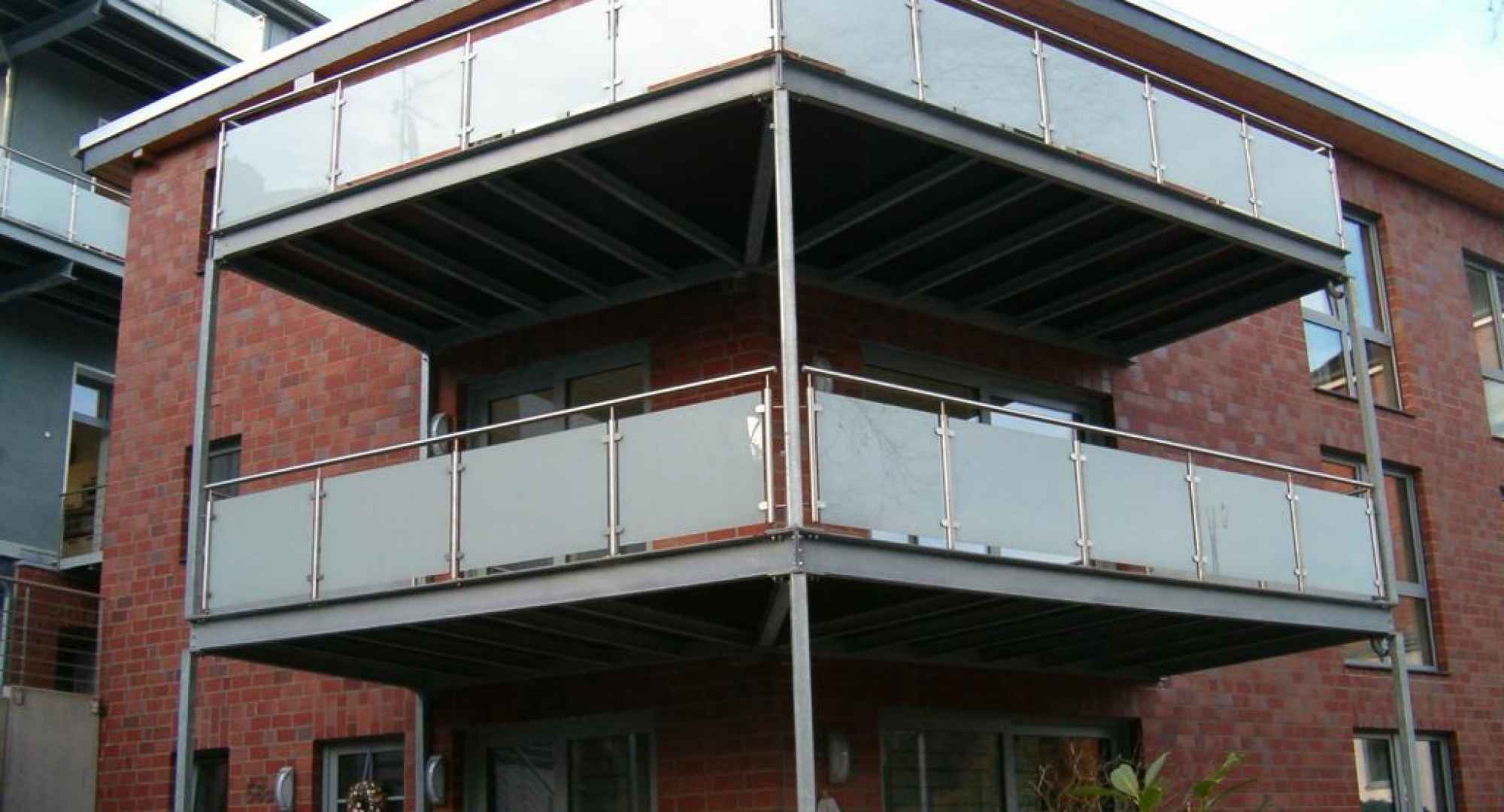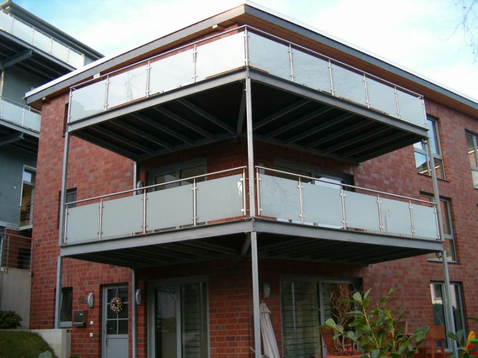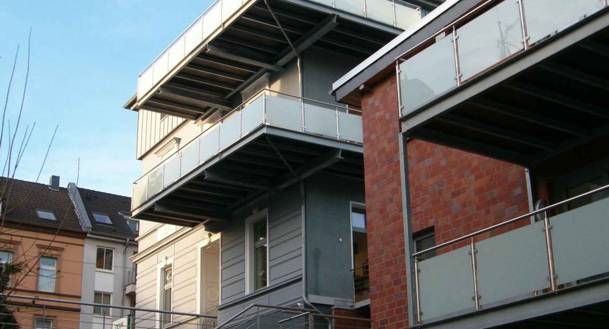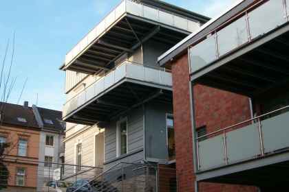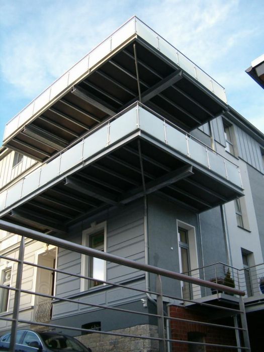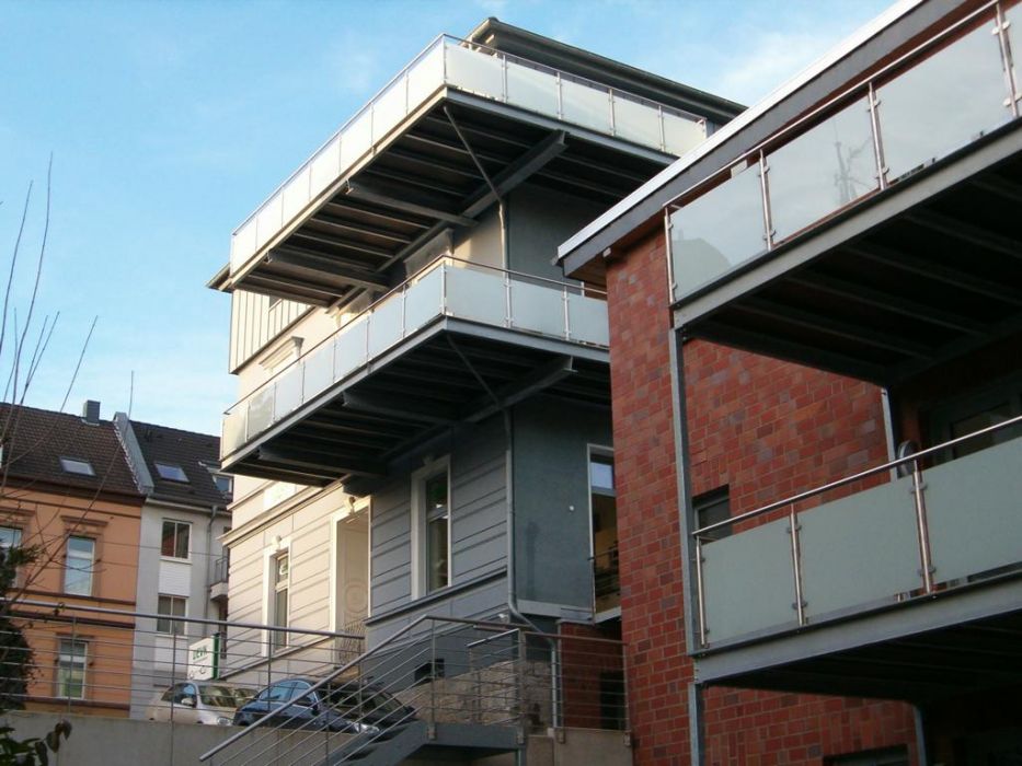 Renovierung und Sanierung der alten Seibel Villa in Mettmann. 2 Stk. neue Balkonanlagen ohne senkr. Stützen (siehe Bild 4). Umlaufender Rahmen aus U-Stahl mit Querträgern. Belag mit Steinplatten im Kiesbett verlegt. Die Geländer wurden ausgeführt in Edelstahl 1.4301, Korn 240, matt gebürstet und Glasscheiben mit matter Folie. Alle Stahlteile der Konstruktion, ausser Geländer, feuerverzinkt nach DIN EN 1461. Hier der dazugehörende nebenstehende Neubau (Bild 1, 2 u. 3). 2 Stk. neue Balkonanlagen auf senkrechten Stützen, sonstige Ausführung wie oben im Text beschrieben.