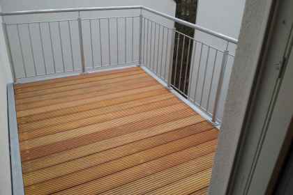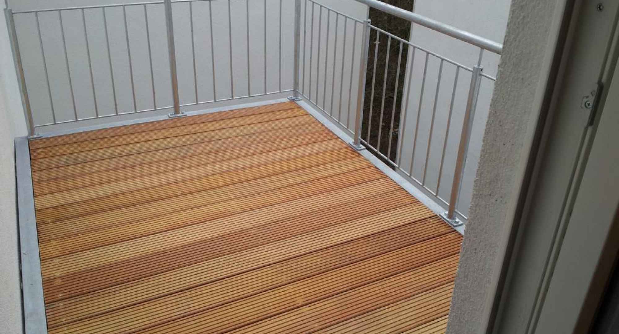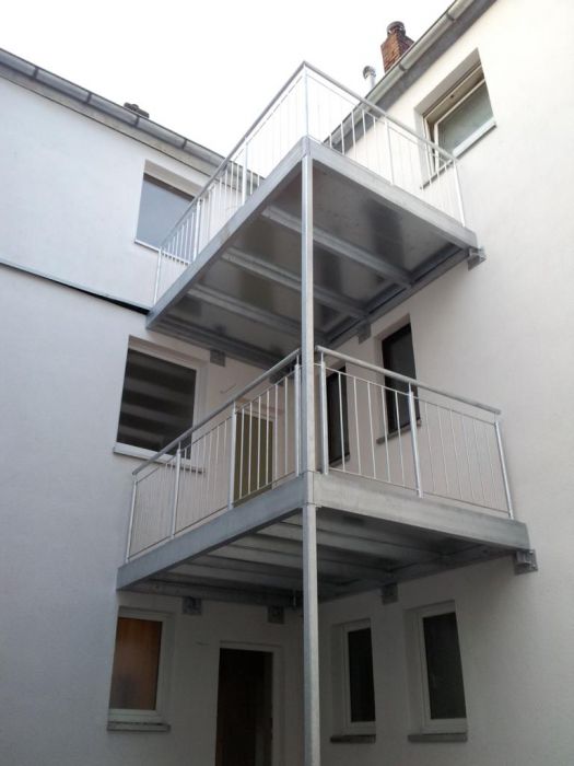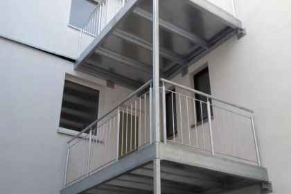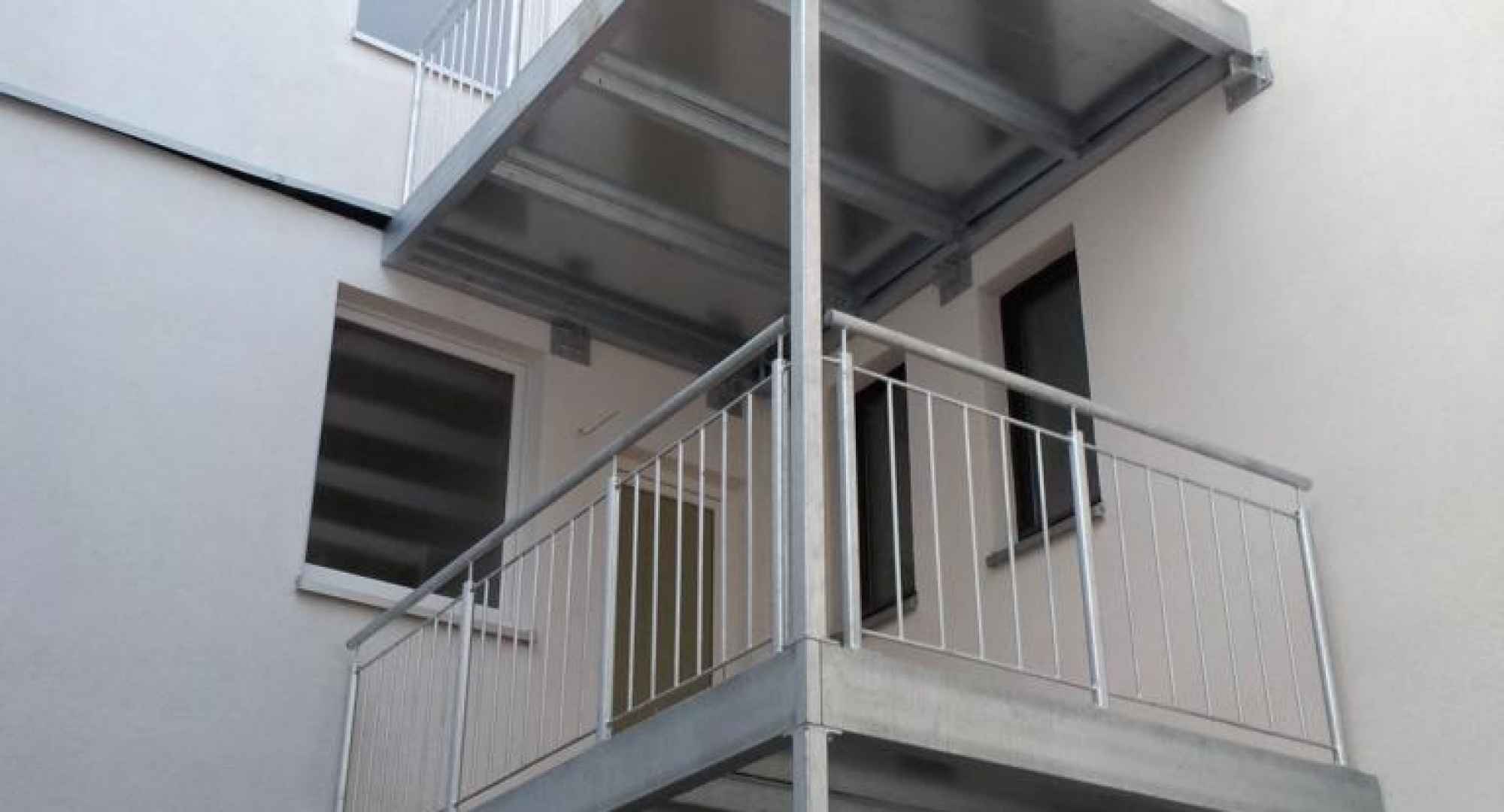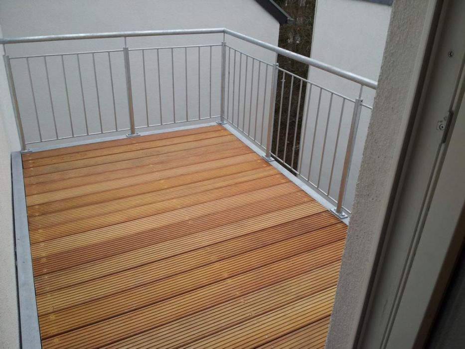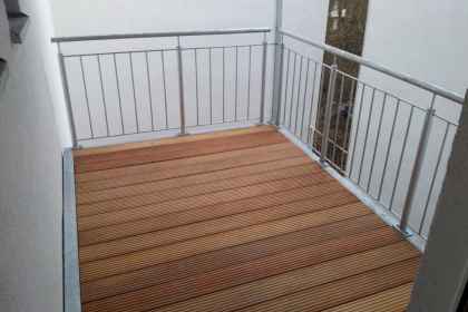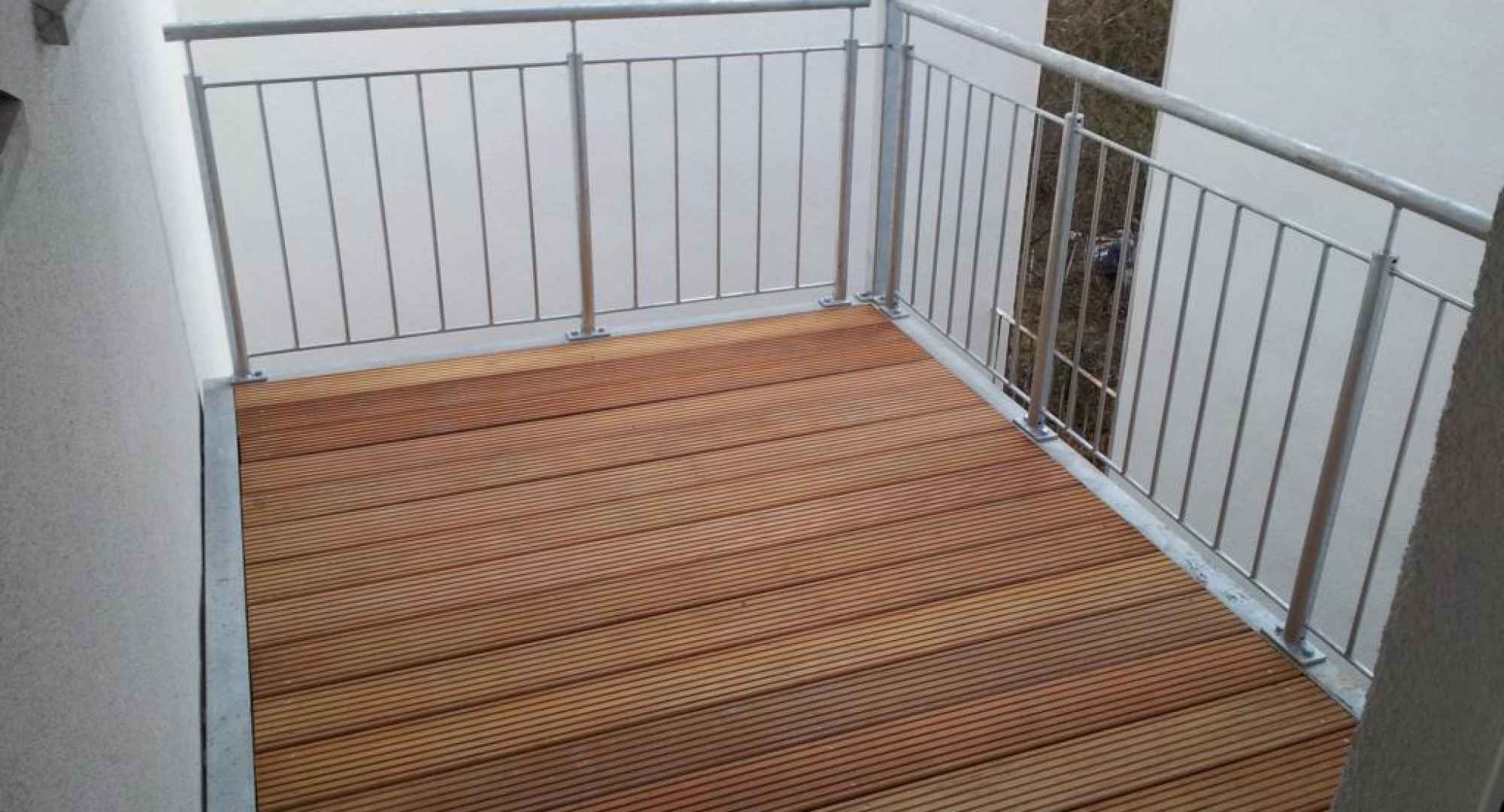 2-geschossige Balkonanlage in einem Innenhof (1. Etage) in Neuss, ausgeführt mit einer Stütze und Wandauflager mit innenliegender Entwässerung. Geländer bestehend aus senkrechten Stäben ø 12mm. Der Holz-Bodenbelag Garappa. Alle Stahlteile feuerverzinkt nach DIN EN 1461.