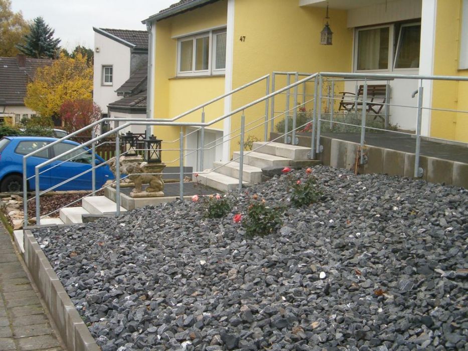 Geländer montiert auf einer Betontreppe eines Privathauses in Soliingen. Füllung der Felder mit zwei Stück Kniegurten sowie Rohrpfosten und Handlauf. Komplett feuerverzinkt nach DIN EN 1461.